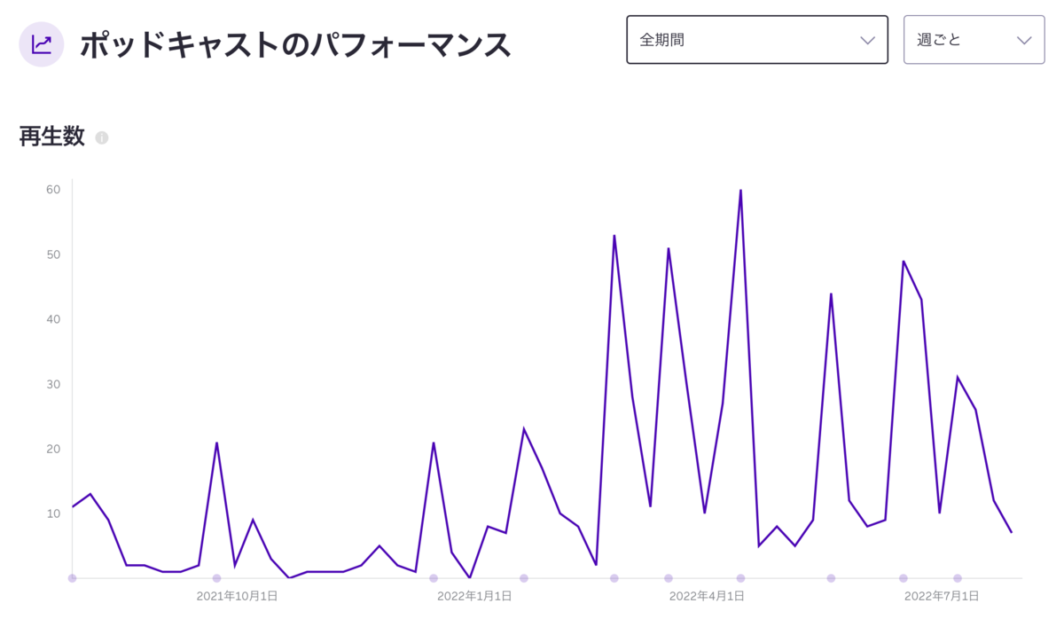 新しいエピソードの公開週は新しいエピソードが30再生ほど、それ以外のエピソードが20再生されています。各エピソードはその後もじわじわと再生され続け60~70再生されるまでになっています。