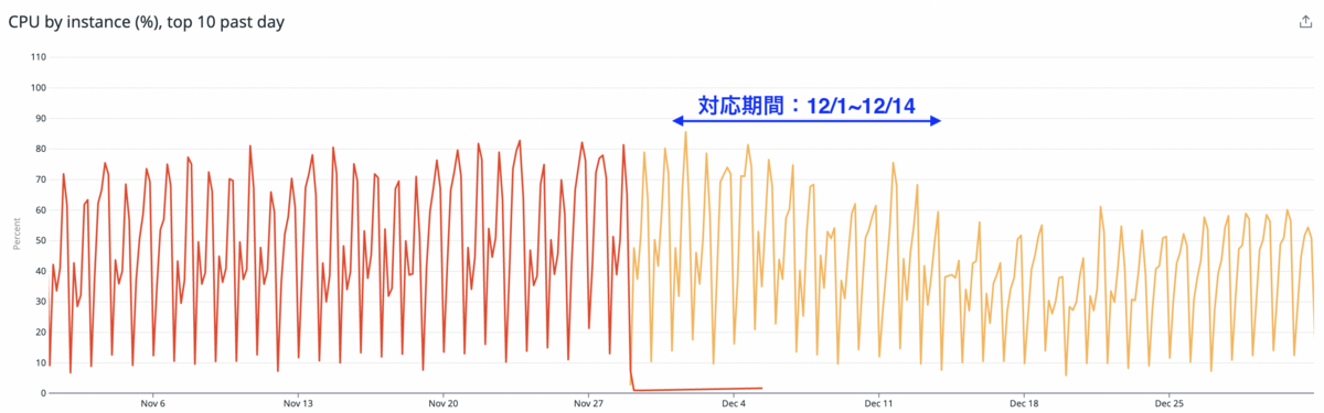 元々80%前後で推移していたDBのCPU負荷は60%前後まで減らせました。