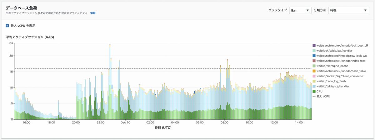 上記の画像では、平均アクティブセッションが最大vCPUのラインを大幅に超えているので、DBの処理が詰まってDBのパフォーマンスに影響しているであろうことが分かります。