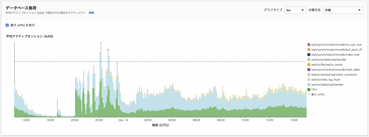 以下の画像は負荷が高かった時間帯のデータベース負荷のグラフです。